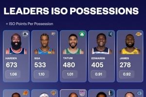 上赛季单打王:哈登单打回合数最高 杜兰特效率第一