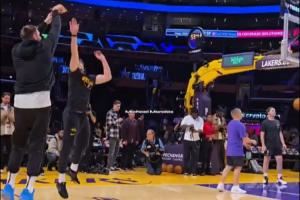 调皮😂!东契奇赛前热身:来防我呀!然后调高弧度三分空心命中