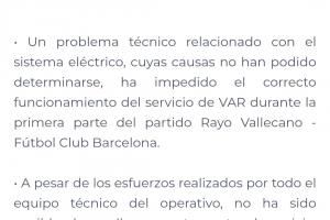 由于电力系统相关技术问题(具体原因尚未查明),导致巴列卡诺对阵巴塞罗那足球俱乐部比赛上半场的VAR服务未能正常运行。