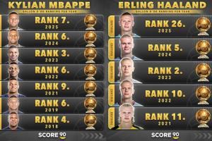 姆巴佩/哈兰德历年金球奖排名对比: