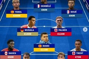 前锋:亚马尔(西班牙,2亿欧元)、登贝莱(法国,9000万欧元)、杜埃(法国,9000万欧元)