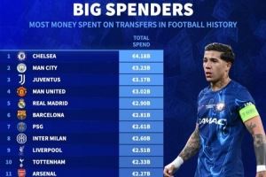 德转列历史转会费支出前20:切尔西领衔英超9队,意甲5队&西甲3队