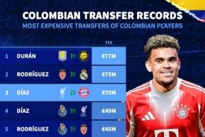 哥伦比亚球员最高转会纪录:杜兰7700万欧第1,J罗第2、迪亚斯第3