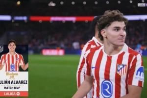 0球0助攻但送出6关键传球!西甲官方:阿尔瓦雷斯当选本场MVP