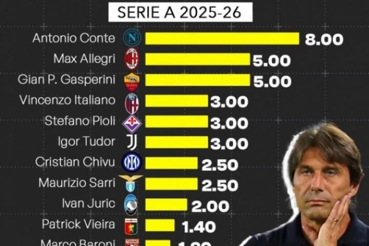 体育资讯08月06日讯 今日,意大利金融媒体Calcio e Finanza统计了25-26赛季意甲各队主帅的年薪排行。